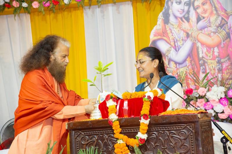स्वामी चिदानन्द सरस्वती जी ने कथाकार चैतन्य मीरा जी और आयोजक परिवार को रूद्राक्ष का दिव्य पौधा भेंट करते हुये सभी को पर्यावरण संरक्षण व प्रकृति के अनुकूल जीवन जीने का संकल्प कराया। स्वामी जी ने कहा कि हमारे भंडारे ऐसे हो जो हमारी धरती पर कचरे का भंडार न करें तथा हमारे मेले ऐसे हो जो हमारे तीर्थ स्थलों को मैला न करें तभी हमारी कथाओं की सार्थकता है।