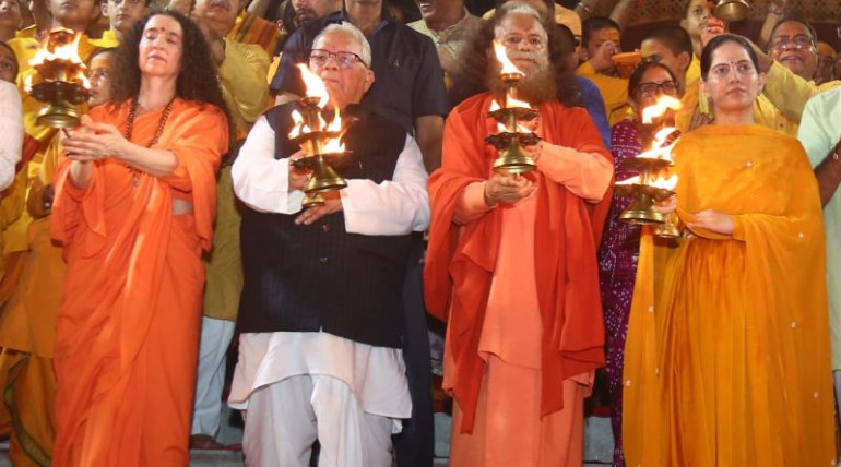 Former Governor of Rajasthan Shri Kalraj Mishraji visited Parmarth Niketan and participated in the divine Ganga Aarti alongside HH Param Pujya Swami Chidanand Saraswatiji, Pujya Sadhvi Bhagawati Saraswatiji, and Jaya…