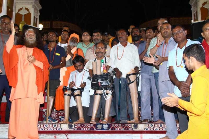 At the closing ceremony of the Disability-Free Camp at Parmarth Niketan, Rishikesh, HH Param Pujya Swami Chidanand Saraswatiji honored and garlanded differently-abled individuals with Rudraksha during the Ganga Aarti. Prosthetic limbs and assistive devices were distributed, empowering them to live self-reliant lives. All the differently abled people were overjoyed to receive the guidance and blessings of Mahamandaleshwar Swami Asanganand Saraswati Ji Maharaj and Pujya Swamiji.
