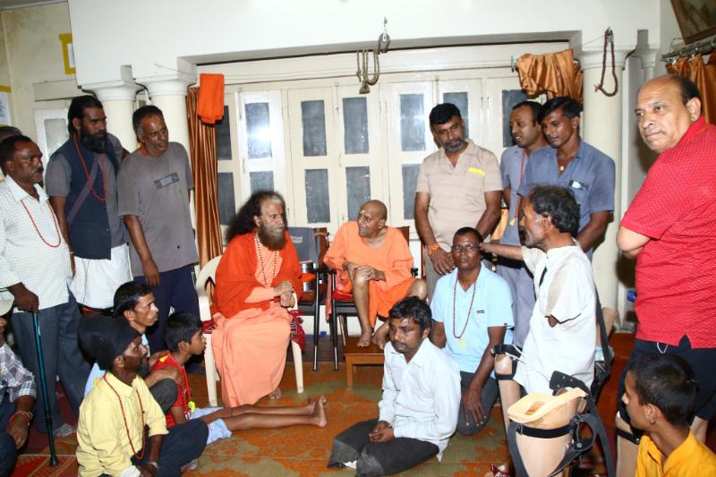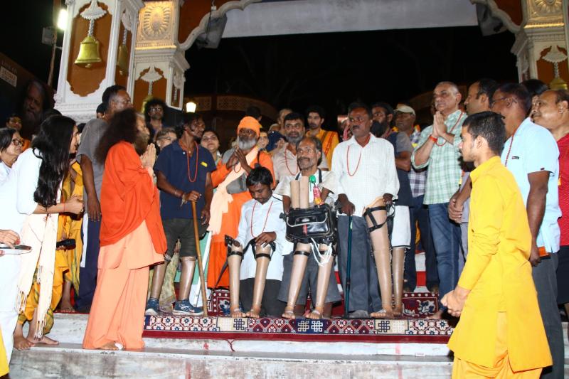 At the closing ceremony of the Disability-Free Camp at Parmarth Niketan, Rishikesh, HH Param Pujya Swami Chidanand Saraswatiji honored and garlanded differently-abled individuals with Rudraksha during the Ganga Aarti. Prosthetic limbs and assistive devices were distributed, empowering them to live self-reliant lives. All the differently abled people were overjoyed to receive the guidance and blessings of Mahamandaleshwar Swami Asanganand Saraswati Ji Maharaj and Pujya Swamiji.