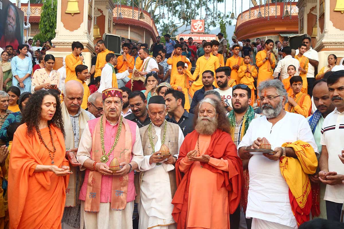 Pujya Swamiji extended birthday wishes to Shri Koshyari ji, lauding his contributions to Uttarakhand’s development and his deep connection with Indian culture and spirituality. The event highlighted the importance of living by cultural values and striving for the nation’s development. Special guests were presented with Rudraksha saplings and cardamom garlands.