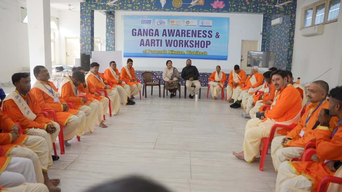 An awareness and Aarti workshop for Ganga was organized by Parmarth Niketan, National Clean Ganga Mission, Namami Gange, and Artha Ganga. The workshop was inaugurated by Pujya Swami Chidanand Saraswatiji, Pujya Sadhvi Bhagawati Saraswati Ji, and priests from various states of India, who lit the lamp to mark the beginning of this event.