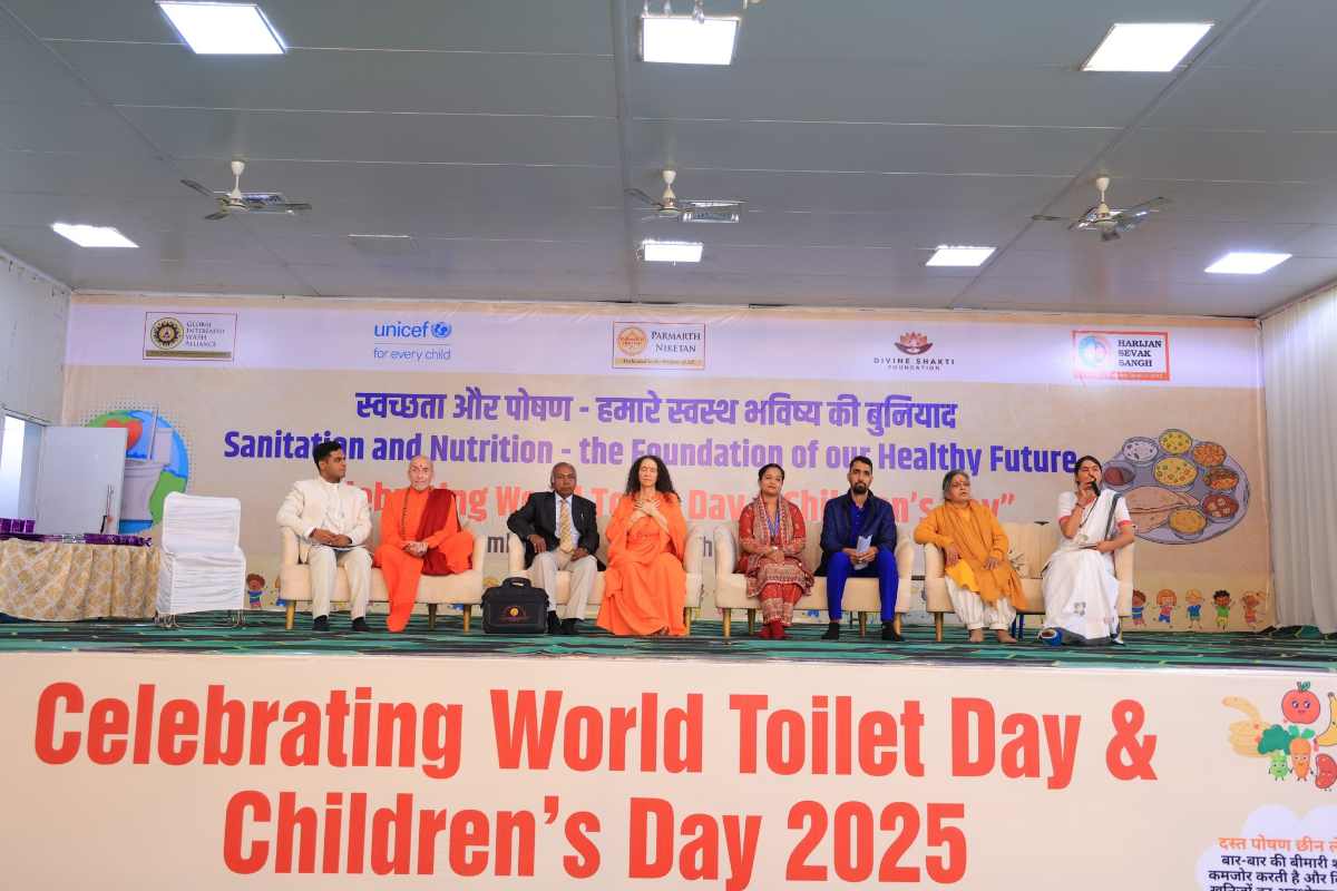 Parmarth Niketan and the Global Interfaith WASH Alliance (GIWA), in collaboration with UNICEF India, Harijan Sevak Sangh, and Divine Shakti Foundation (DSF), organized a grand and heartwarming joint celebration of World Toilet Day and World Children’s Day. The enthusiastic participation of over 500 students, teachers, sanitation workers, ASHA and Anganwadi workers, community leaders, and partner organizations made the event special.