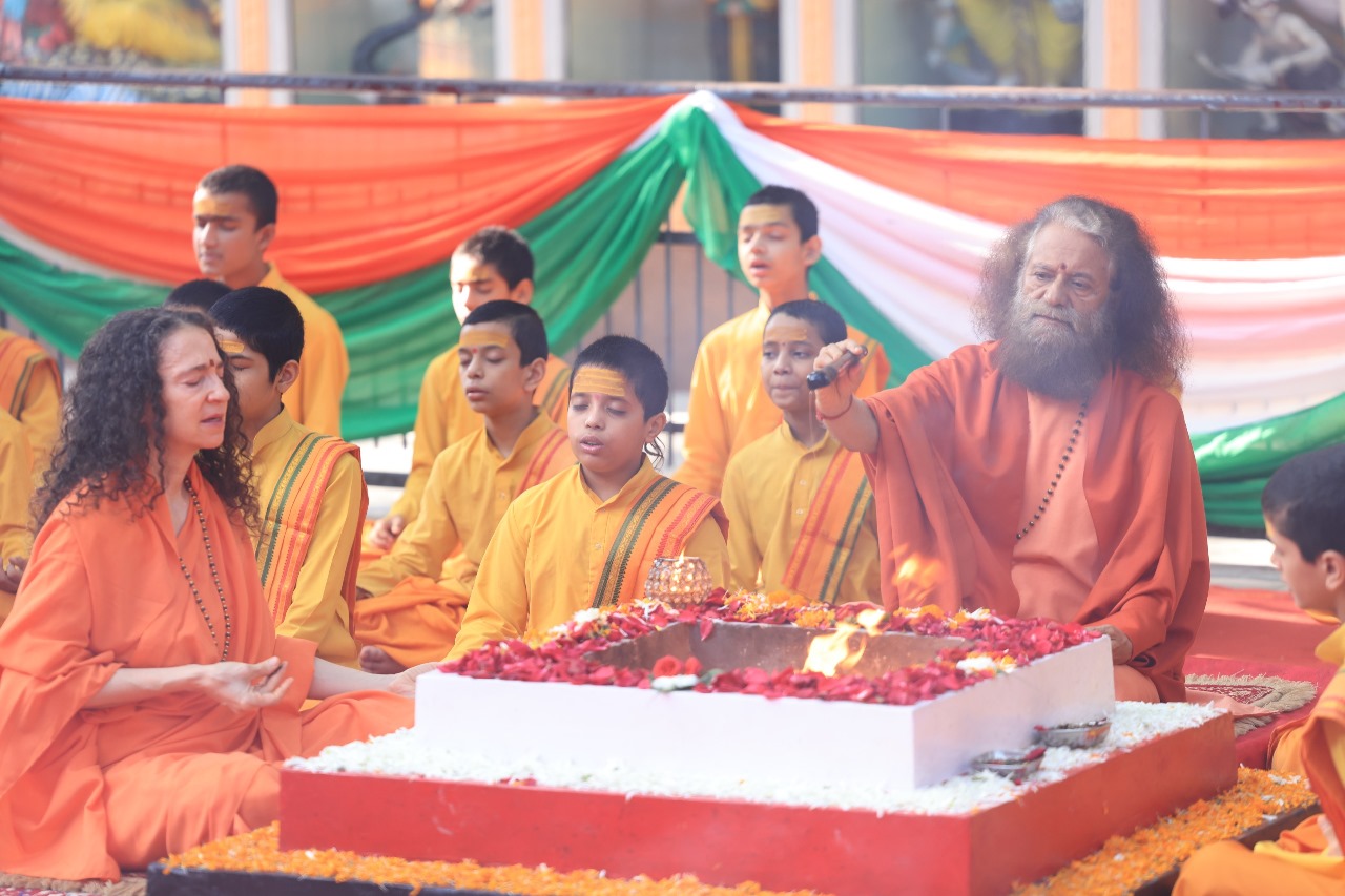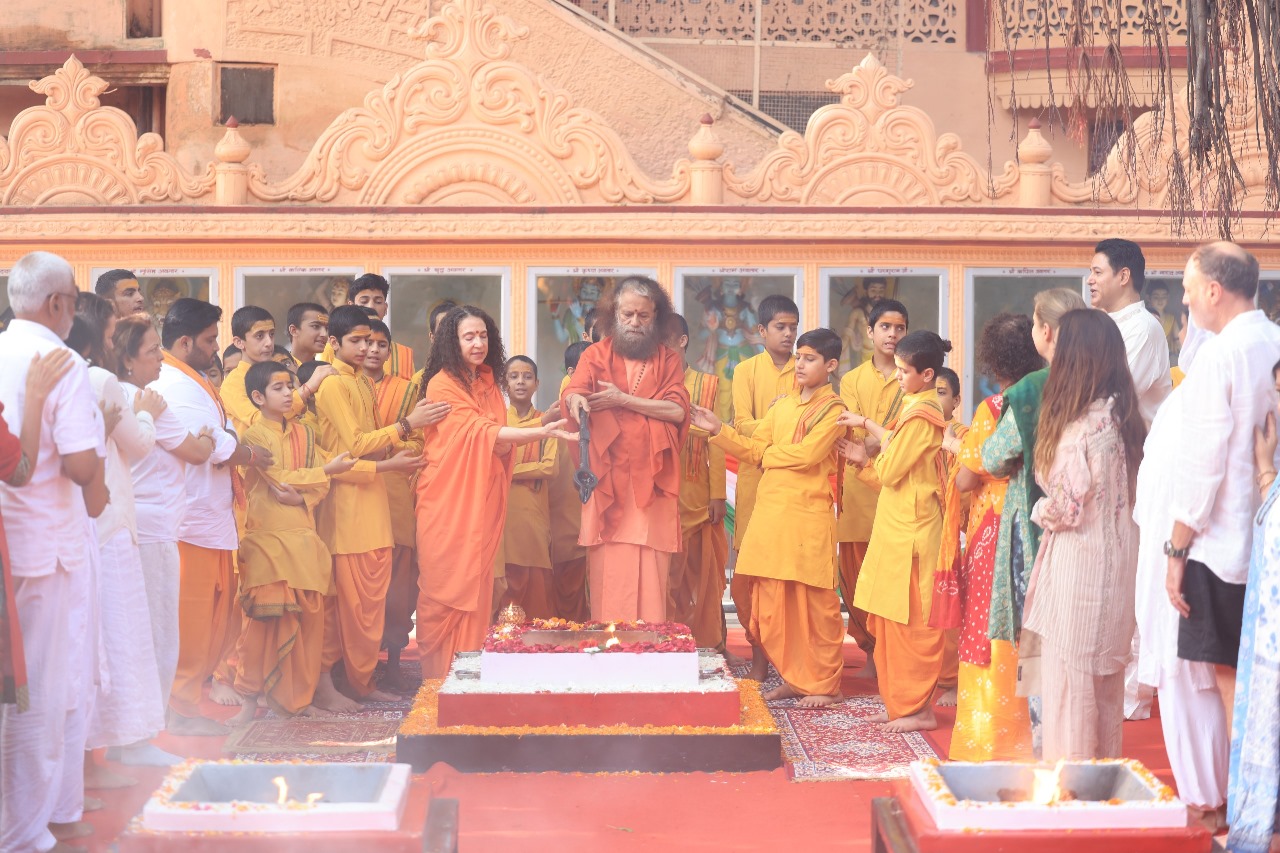 At Parmarth Niketan, on the occasion of Vijayadashami, a world peace yajna was performed, accompanied by the worship of divine scriptures and the symbolic message of peace through weapons.
