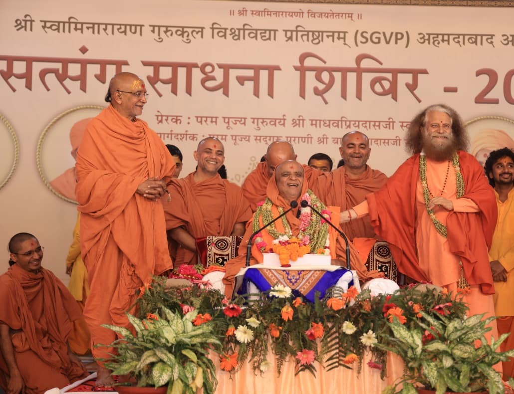 A divine confluence of spirituality and sadhana graced the holy Ganga banks at Parmarth Niketan today. The Satsang Sadhana Shivir, organized by Shri Swaminarayan Gurukul University, Ahmedabad, was inaugurated in