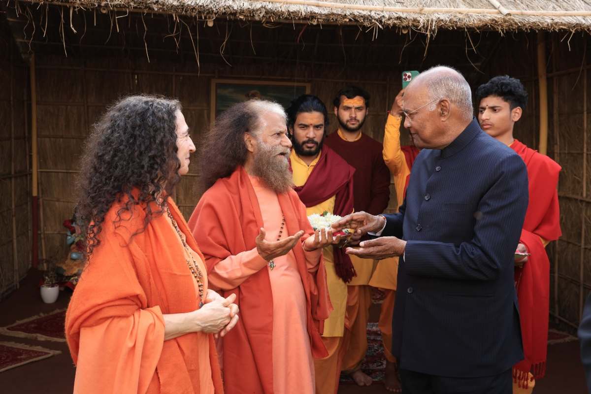 Prayagraj, 22 January: Shri Ram Nath Kovind Ji, the 14th President of India, visited Parmarth Niketan Camp today with his family. Honorable Kovind Ji, along with Mrs. Savita Kovind and daughter Swati Kovind, had a soulful meeting with Revered Swami Ji and Revered Sadhvi Ji. They also visited the newly constructed Parmarth Triveni Pushp at Arail, Prayagraj, and observed various activities and projects being operated by Parmarth Niketan.
