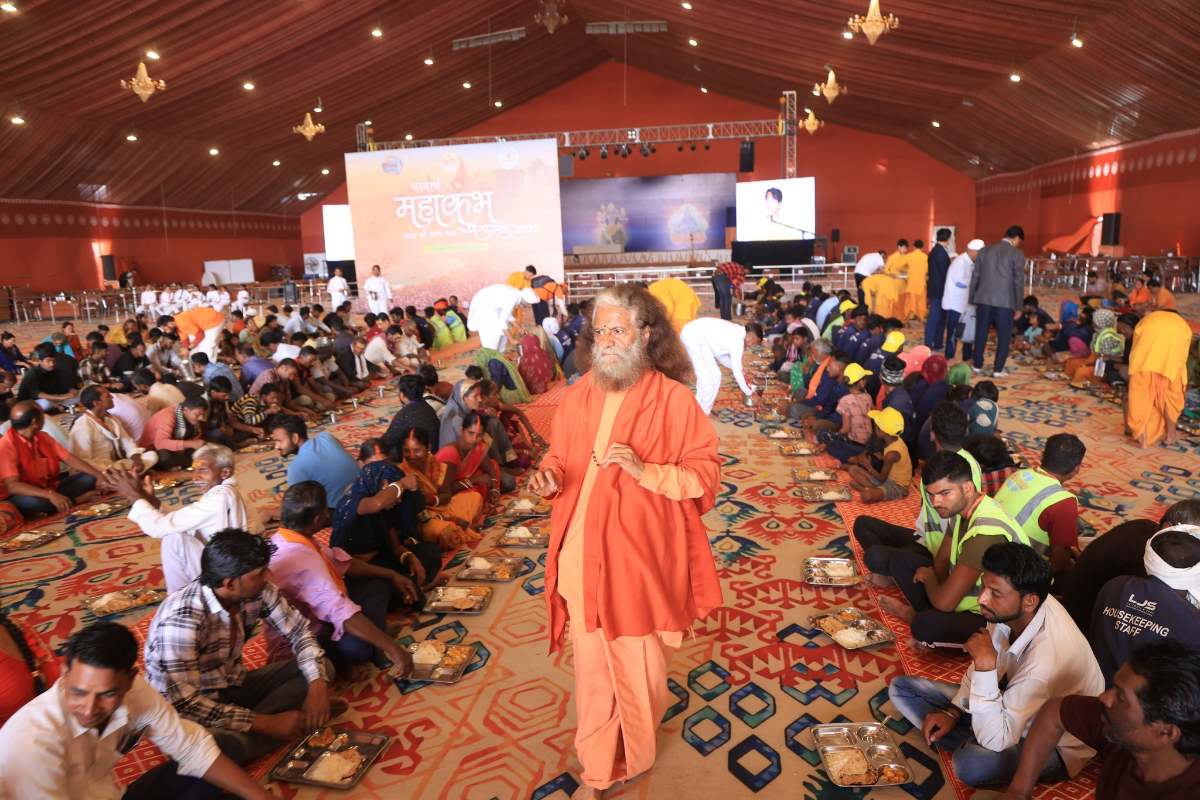 Today, a grand Bhandara was organized at Parmarth Niketan Camp, where Swami Ji and the Hinduja family served food to the cleanliness workers, devotees, and tourists. Swami Ji mentioned that Bhandara service awakens the spirit of humanity.