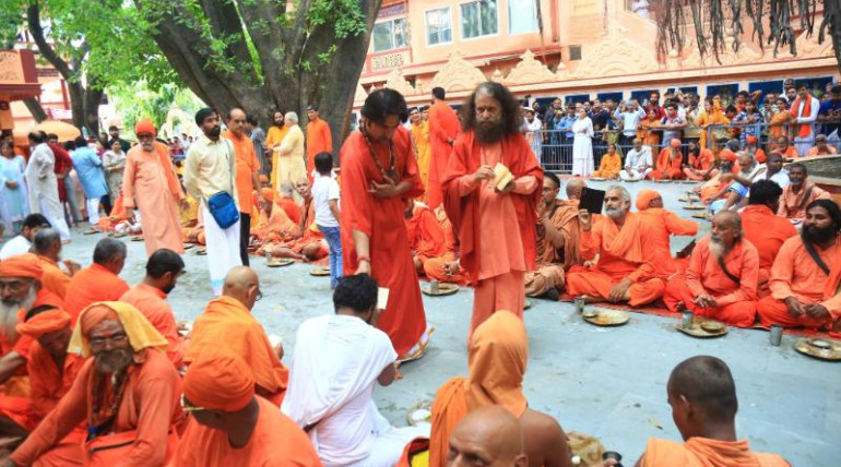Pujya Swamiji and Shri Dhirendra Krishna Shastriji served food with great love to the saints, mahants and srishikumars in the premises of Parmarth Niketan today.
