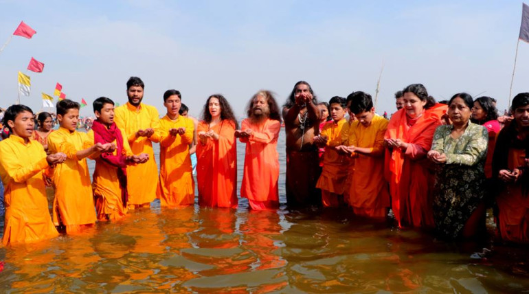 International Delegation Arrives at Parmarth Niketan Camp in Prayag Raj Kumbh Mela