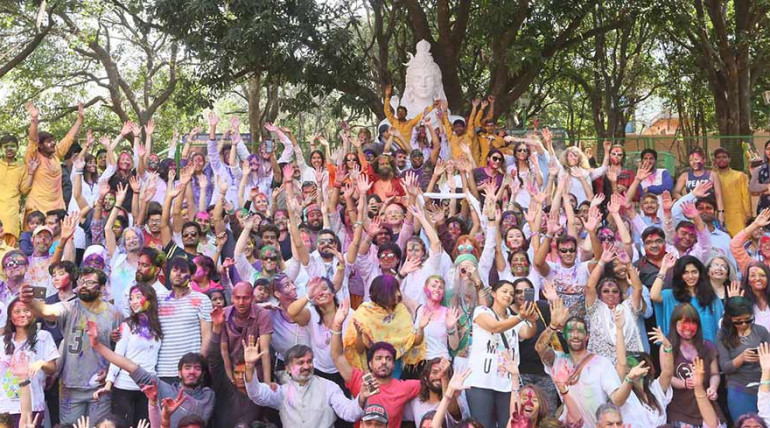 Holi Played with Yogis from Over 100 Nations & Renowned Percussionist Sivamani on Second Day of International Yoga Festival