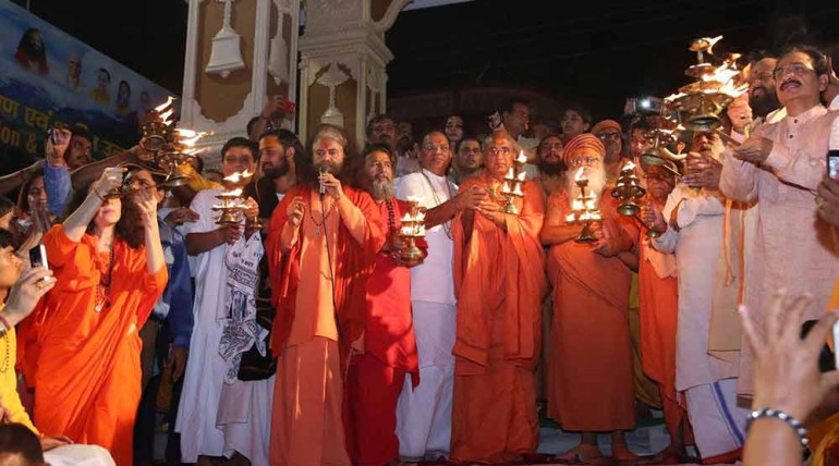 Pujya Bhaishri Rameshbhai Ozaji, Head Priest of Jagannath Temple Pujya Dilipdasji joined Pujya Swami Chidanand Saraswatiji and Sadhvi Bhagawati Saraswatiji during the Ganga Aarti ceremony to lead a pledge for…