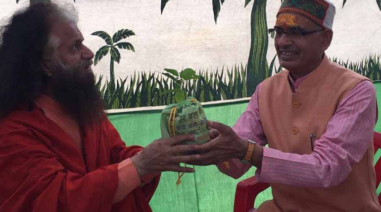 Hon’ble Shivraj Chauhanji gifts a sacred Peepal sapling to Pujya Swamiji