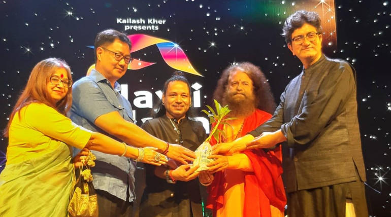 HH PUJYA SWAMI CHIDANAND SARASWATIJI JOINS A HOST OF CELEBRITIES AND OFFICIALS IN CELEBRATING KAILASH KHER’S BIRTHDAY.