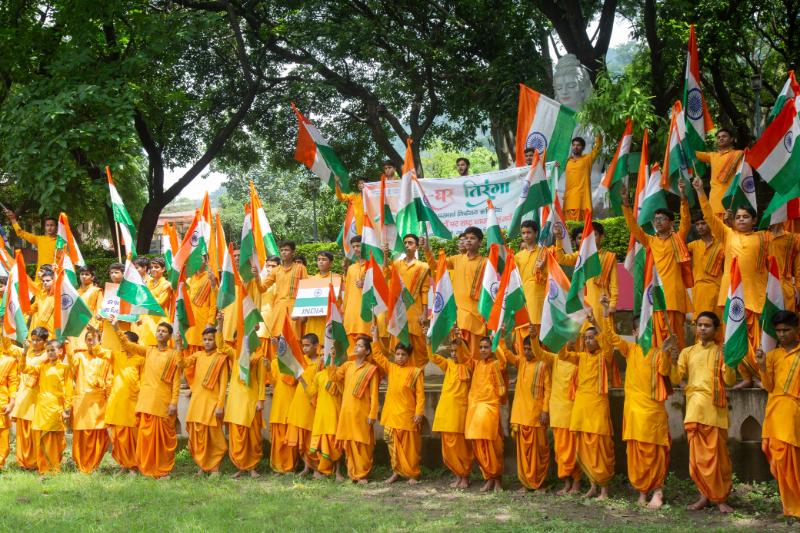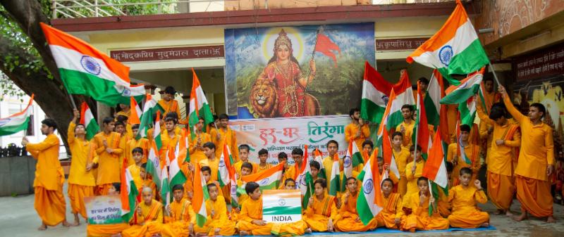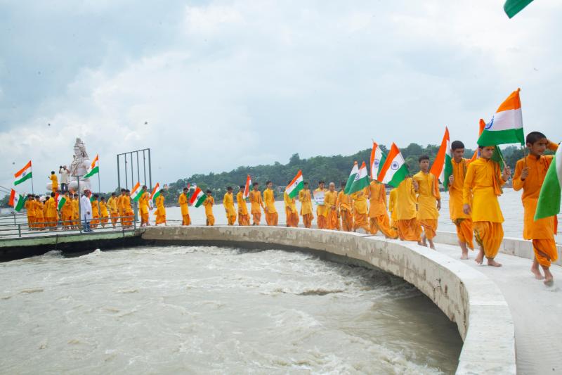 As India prepares to celebrate her 78th Independence Day tomorrow, the Har Ghar Tiranga Abhiyan was in full-force at Parmarth Niketan as the Rishikumars of Parmarth’s Gurukul staged a patriotic rally complete with the national flag in their hands and patriotic songs and slogans on their lips.