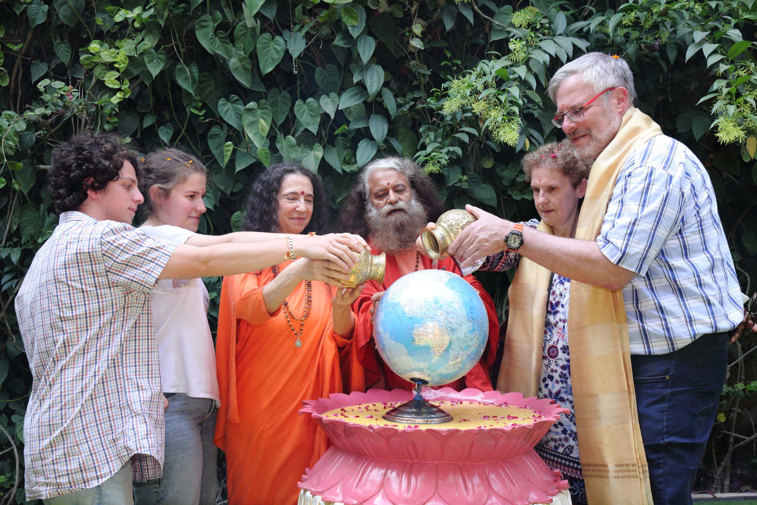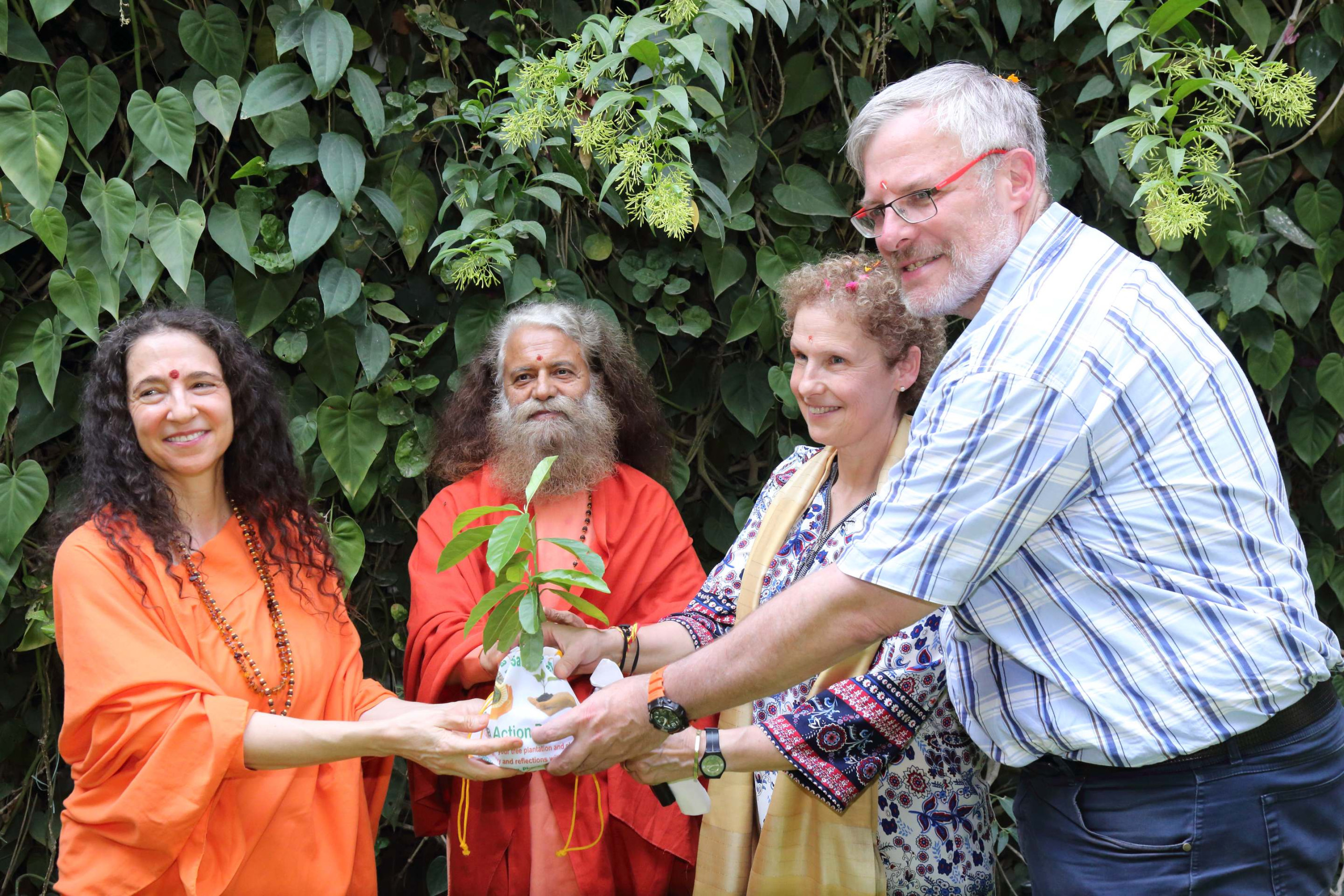 Pujya Swamiji and Pujya Sadhivji thanked the Embassy of Israel for the work being done for environmental and water conservation and affirmed their commitment to explore and implement new programmes and initiatives to face the climate challenges that lie ahead. To demonstrate that commitment, they all took part in the traditional water-blessing ceremony, the Jalabhishek of the World Globe, and the Gillon family was presented with a sacred Rudraksh sapling for plantation at the Embassy in Delhi.