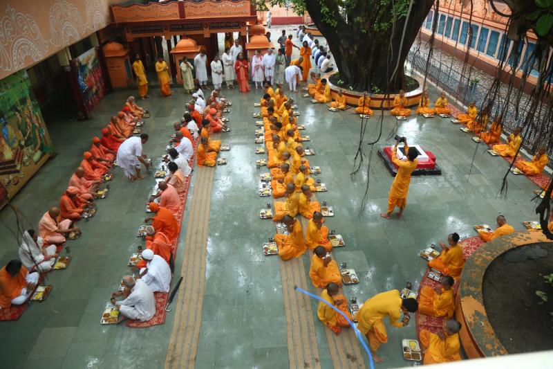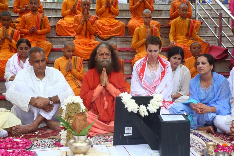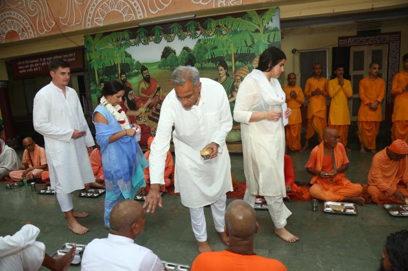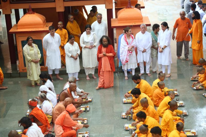 In the holy presence of Parmarth Niketan President HH Param Pujya Swami Chidanand Saraswatiji – Muniji, the 25th US Ambassador to India and currently the Deputy Secretary of State for Management and Resources, Mr. Rich Verma, his wife Pinky Verma, children Lucy Verma, Zoe Verma, Dylan Verma and sisters Lucky, Rita and Roma served bhandaar to revered saints, Rishikumars and the destitute at the Parmarth Niketan campus.