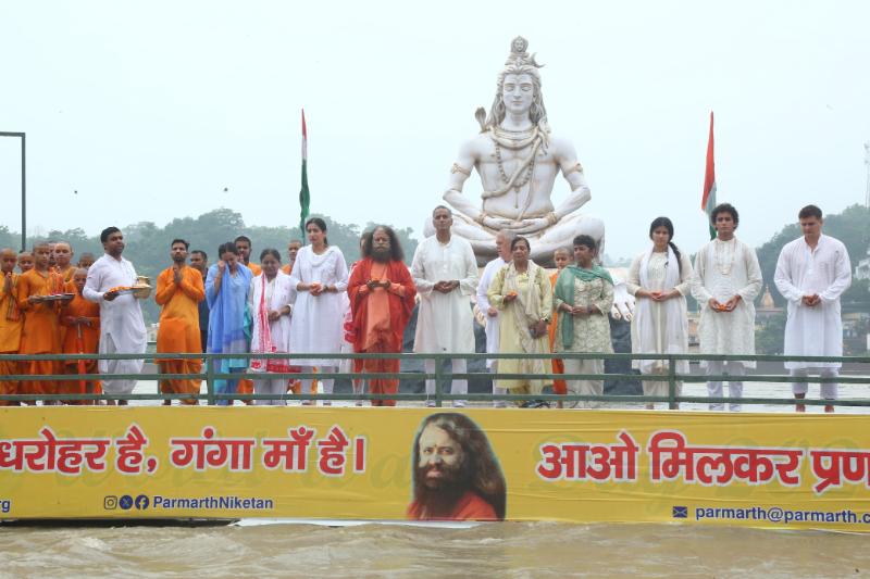HH Param Pujya Swami Chidanand Saraswatiji warmly welcomed the 25th US Ambassador to India and the current Deputy Secretary of Management and Resources of the United States, Mr. Rich Verma, Home to Parmarth Niketan, along with his family, to celebrate Rakshabandhan and offer the Sacred Ganga Aarti, as they have so frequently in the past.