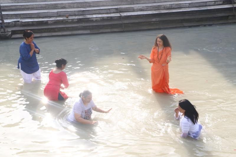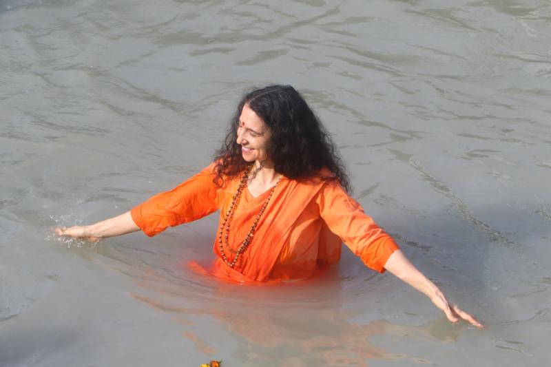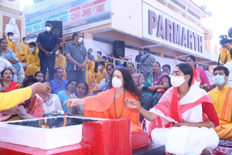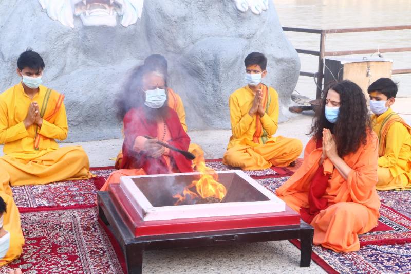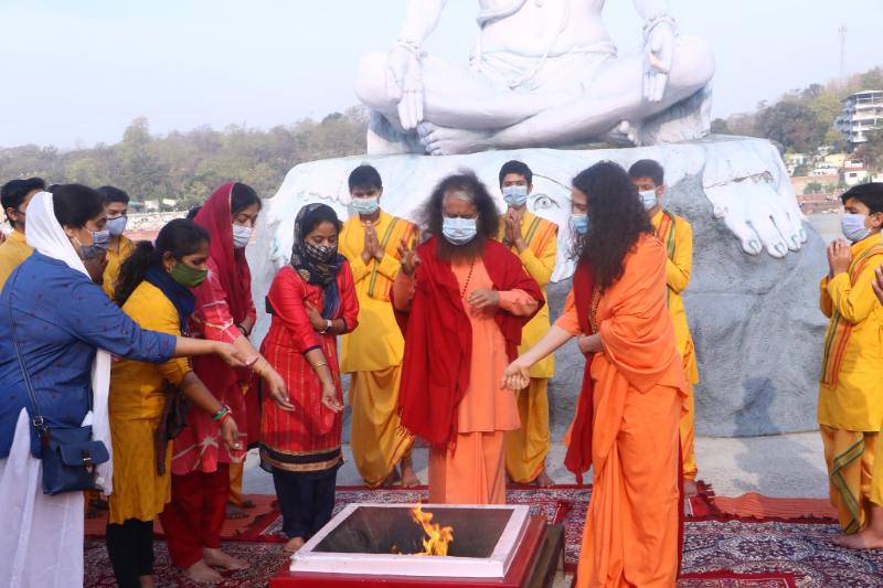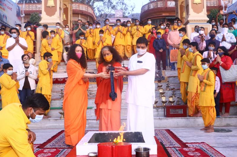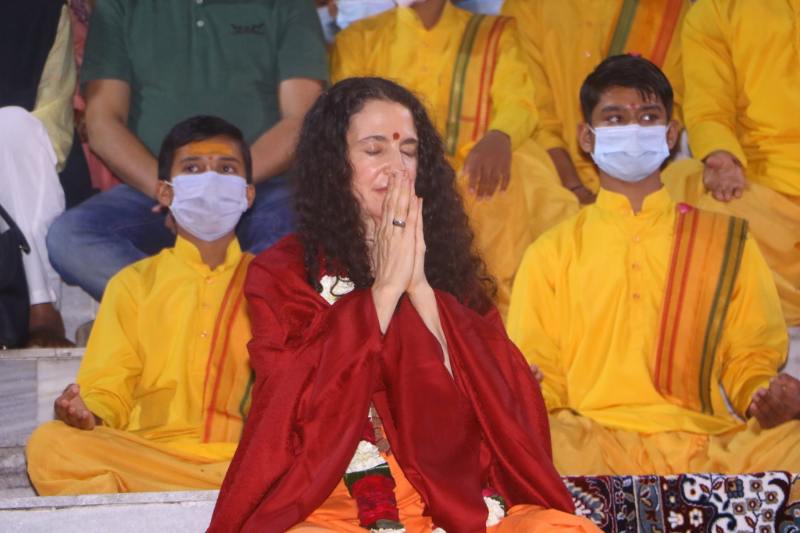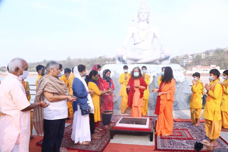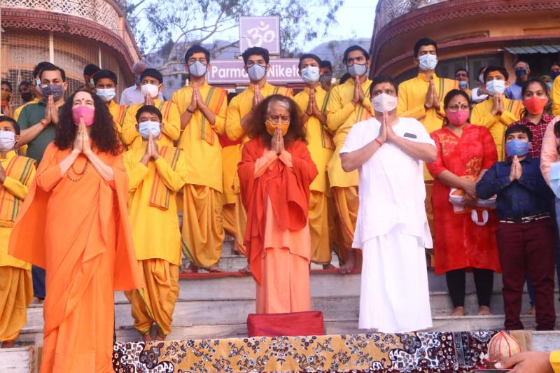 This year her birthday beautifully coincided with Mahashivratri (11th March), the Haridwar Kumbh Mela, the conclusion of our first ever online International Yoga Festival and the Hon’ble Speaker of the Lok Sabha Shri Om Birlaji and his families visit to Parmarth from the 13-14th March. On Shivratri she took part in a beautiful Shiva Abhishek and in the evening more sacred prayers and Rudrabhishek took place. The next morning a beautiful yagna on the iconic Shankar Bhagawan Ghat with her Guru Pujya Swami Chidanand Saraswatiji – Muniji and Parmarth family. Thereafter she took a joy filled Ganga Snan with devotees and sevaks bathing in the sacred waters of Maa Ganga.